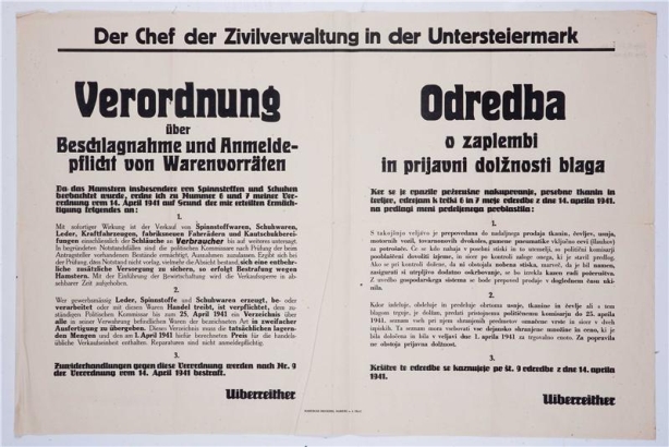 Napis na plakatu: Verordnung: Odredba o zaplembi in prijavi dolžnosti blaga tisk Marburger Druckerei, 1941, Maribor črno bel.